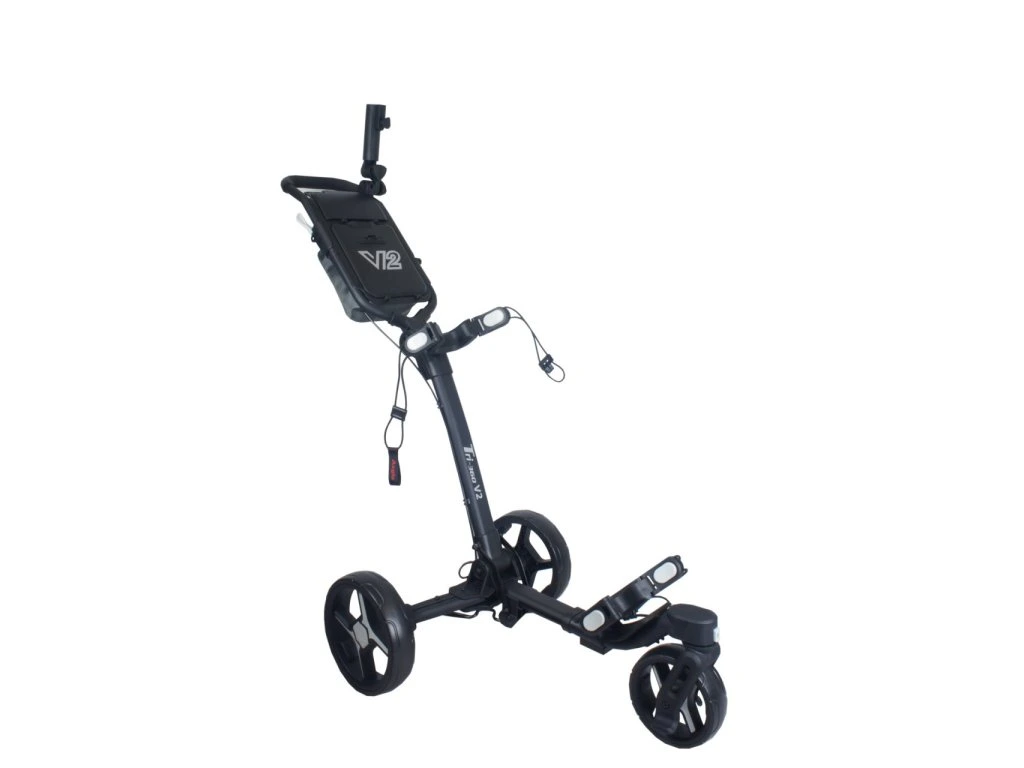 Tri-360 V2 vyniká také mimořádně jednoduchým ovládáním: složení i rozložení zvládnete jediným pohybem. Pevný uchycovací stojan s nastavitelným popruhem spolehlivě podrží většinu typů a velikostí golfových bagů.