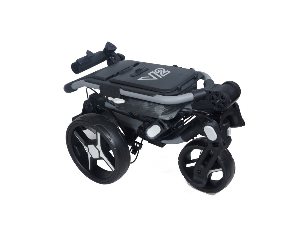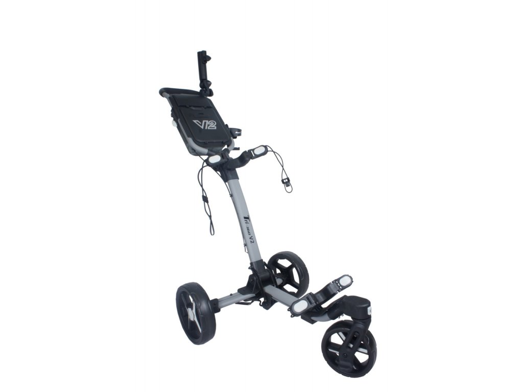 Tri-360 V2 vyniká také mimořádně jednoduchým ovládáním: složení i rozložení zvládnete jediným pohybem. Pevný uchycovací stojan s nastavitelným popruhem spolehlivě podrží většinu typů a velikostí golfových bagů.