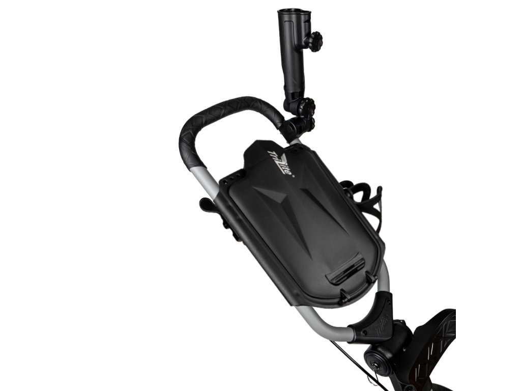 Součástí vozíku je prostorná konzole s úložnými přihrádkami na míčky, týčka či mobilní telefon, držák na score kartu i snadno přístupné upevnění bagu.