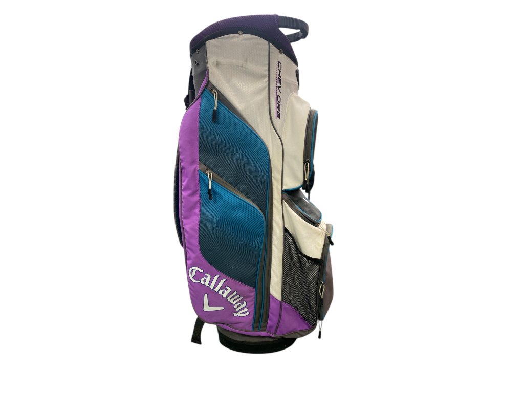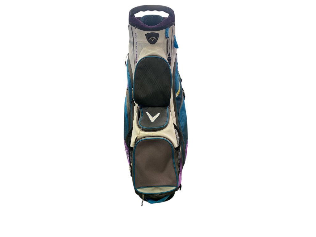 Použitý cartbag Chev Org od značky Callaway. Organizér golfových holí má 14 přihrádek na golfové hole, 8 kapes na příslušenství. Prostorný systém kapes zajišťuje pohodlnou organizaci Vašeho golfového vybavení. U bagu je cover proti dešti.
