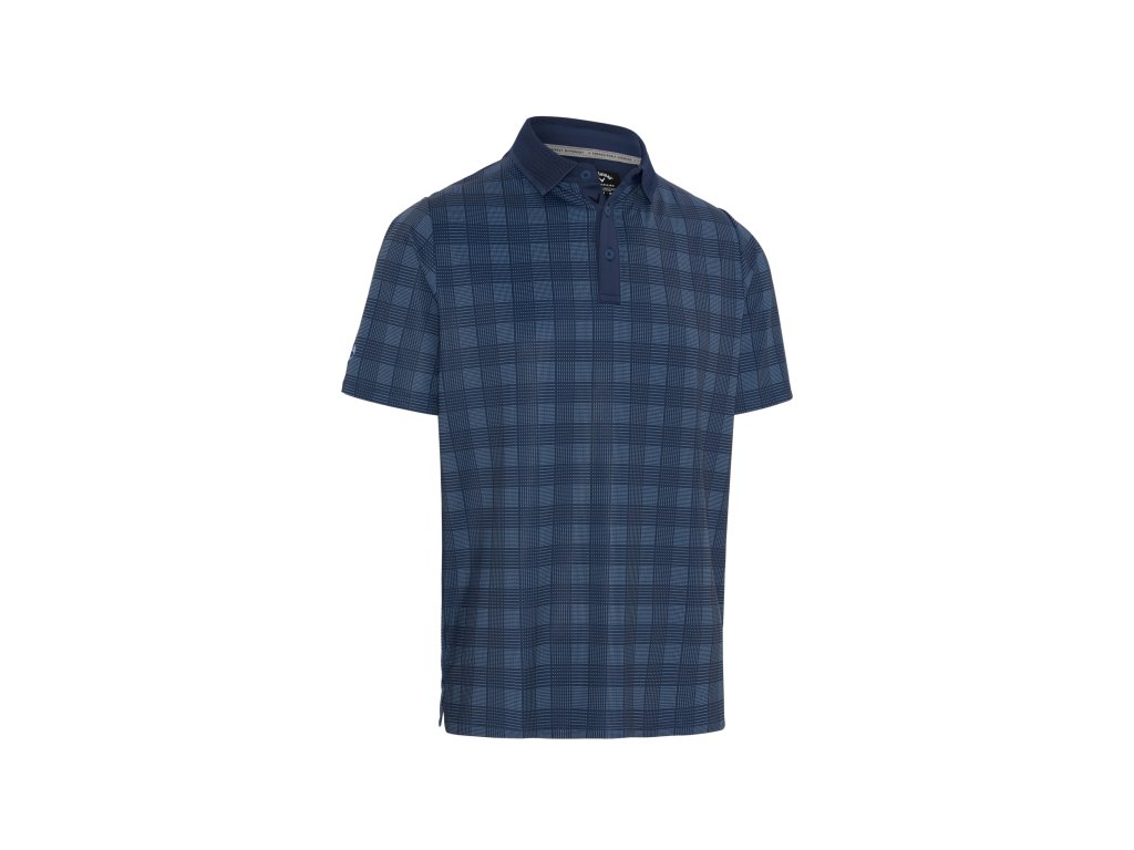 Pánské golfové tričko Callaway Chev Plaid print s límečkem a celoplošným „plaid“ (kostkovaným) potiskem – design vhodný jak pro golfové hřiště, tak pro volnočasové nošení.