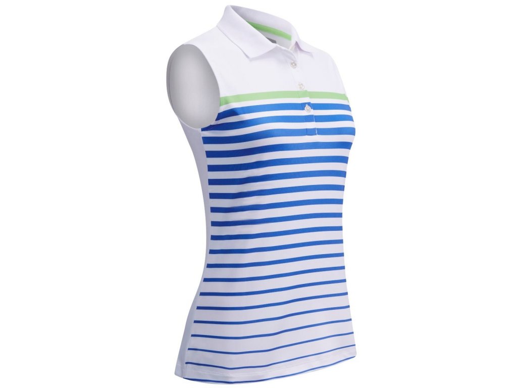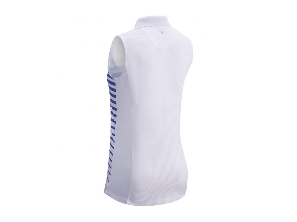 Dámské golfové tričko Printed Stripe je vyrobeno ve sportovním i elegantním stylu jak na hřiště tak i mimo něj. Tričko je navrženo v bílé barvě s pruhovaným vzorem. Tričko je bez rukávů, má límec se čtyřmi knoflíky. Na zadní straně na límci je jemné logo CALLAWAY. Technologie Opti-Stretch má vrstvy Spandexu a Lycry všité do látky zajišťují, že se oblečení dostatečně natáhne spolu s vaším golfovým švihem. Technologie Opti-Dri odvádí pot od těla. Materiál je z 95% Polyesteru a 5% Elastanu.