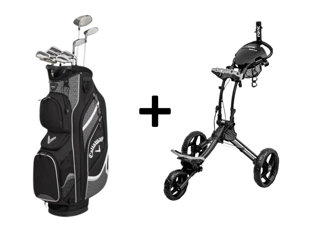 Výhodná kombinace kvalitního golfového setu CALLAWAY SOLAIRE 24 na pravou stranu a 3-kolového černého vozíku Clicgear Rovic RV1C 2.0.