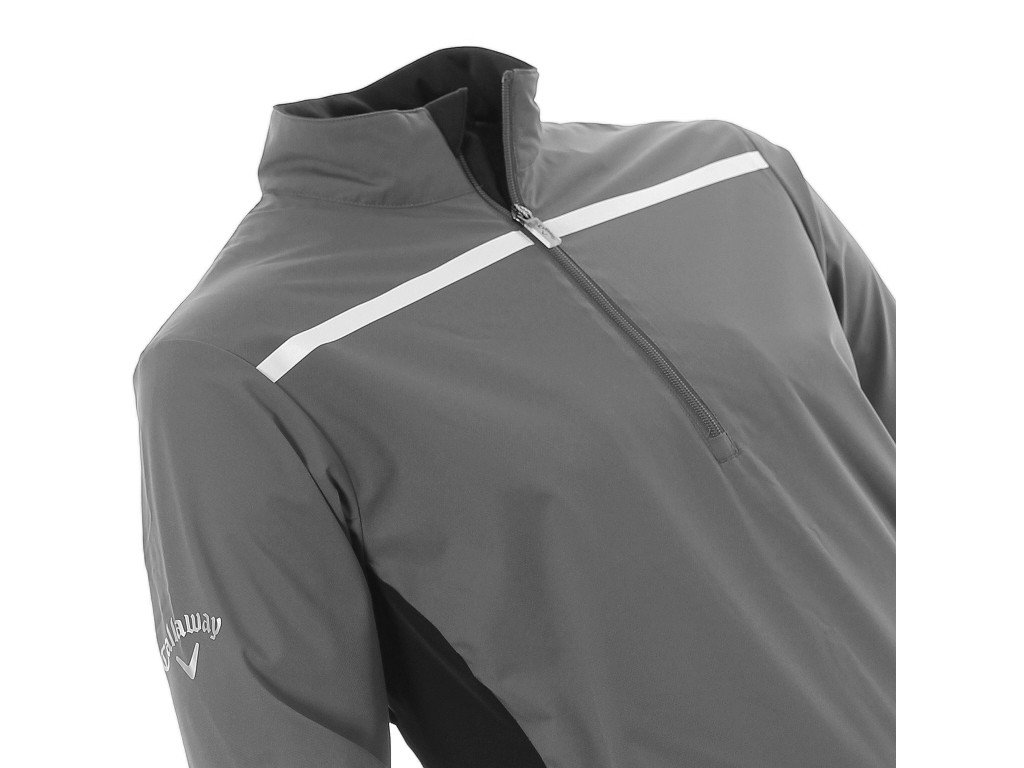 Callaway pánská bunda je uzpůsobena do větru a má voděodolný materiál. Bunda má v přední části na hrudi kontrastní bílý pruh. Na pravém rukávu má Callaway logo a Chev logo na zádech. Technologie Opti-Repel je voděodolný a větruodolný materiál. Technologie Opti-Stretch má vrstvy spandexu a lycry všité do látky zajišťují, že se oblečení dostatečně natáhne spolu s vaším golfovým švihem. Složení materiálu je 100% Polyester.