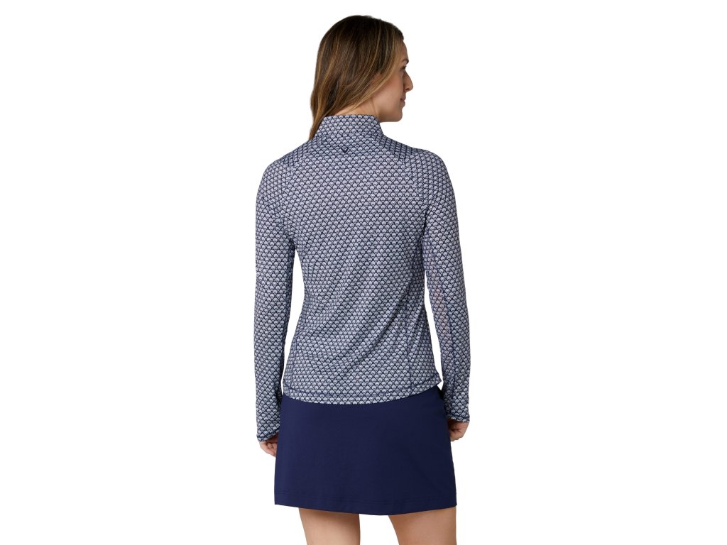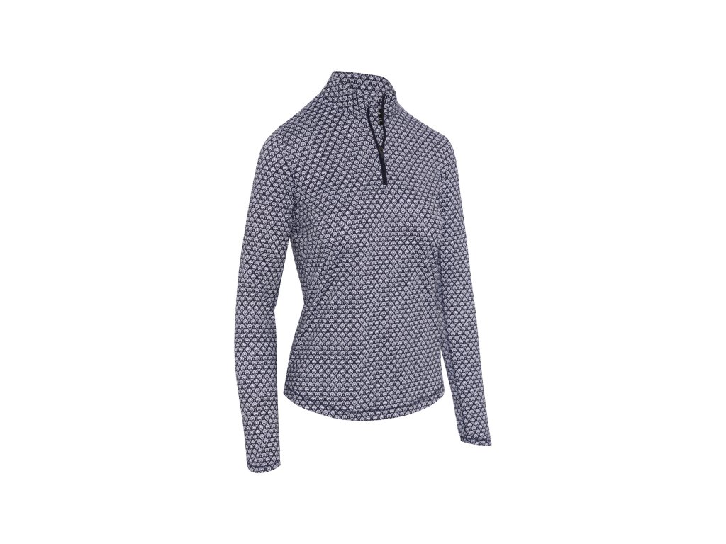 Tento dámský golfový top z řady Geo je navržený s moderním geometrickým potiskem a elegantními designovými detaily, které mohou zahrnovat motiv připomínající šátek („scarf“) kolem výstřihu nebo ramenní části.