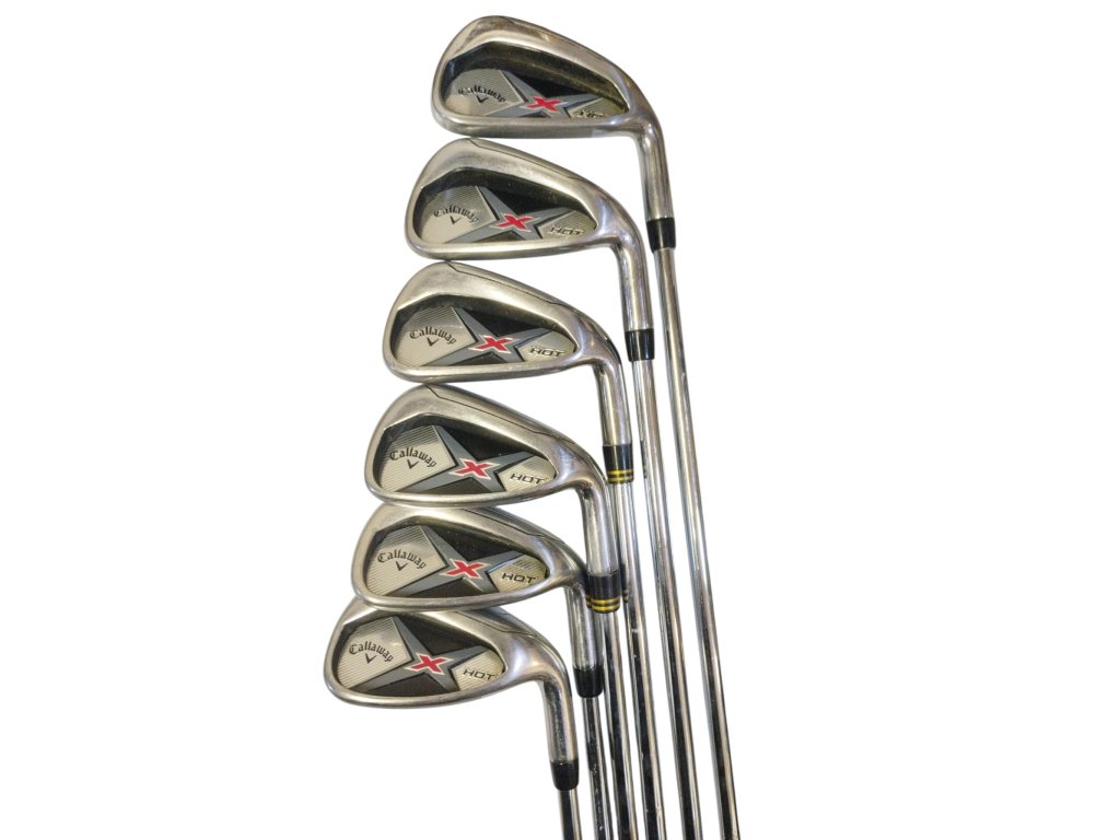 Použitá sada golfových želez CALLAWAY X-Hot v hraném stavu. Sada želez obsahuje 6 holí ve složení 5-PW s gripem Callaway. Hole mají ocelové shafty True Temper s regular flex. Sada je určena pravorukým golfovým hráčům.