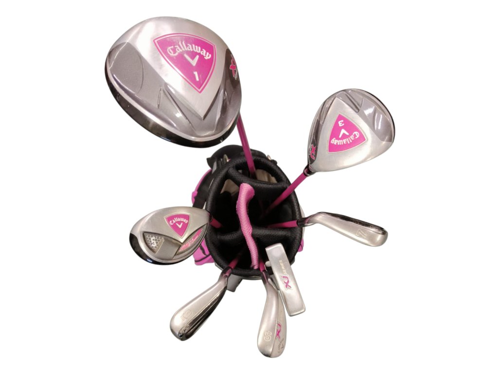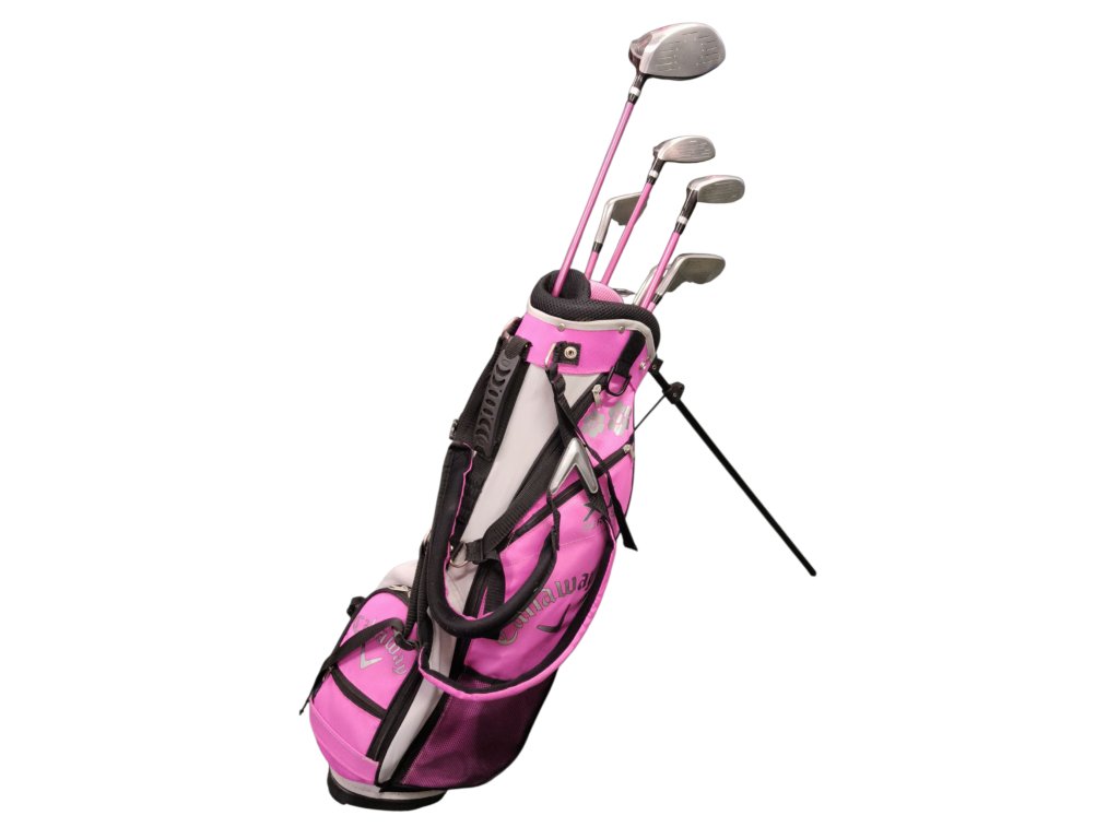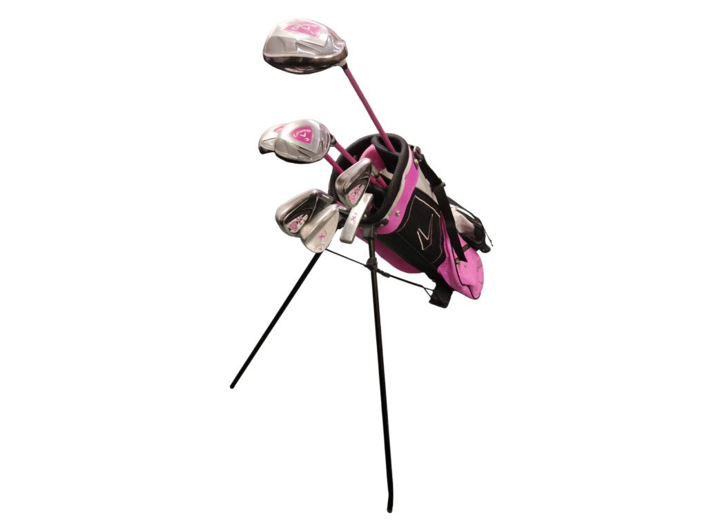 Dětský golfový set Callaway XJ Series pro dívky o výšce 138-155 cm v hraném stavu. Set obsahuje driver, fairwayové dřevo č.3, hybrid č.5, železa č.7,9,SW, putter typu blade a standbag. Tyto hole jsou na grafitových shaftech s junior flex. Set je určen pravorukým hráčkám.