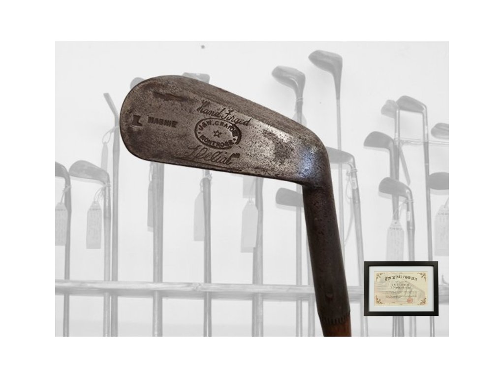 Dobře čitelný znak pušky nám dává tušit, že v ruce držíme historickou golfovou hůl od bratří Johna a Williama Craigieových. Hůl je na původním dřevěném hickory shaftu. Dokonce i grip je zachován ve zcela původním stavu. K holi náleží certifikát pravosti.