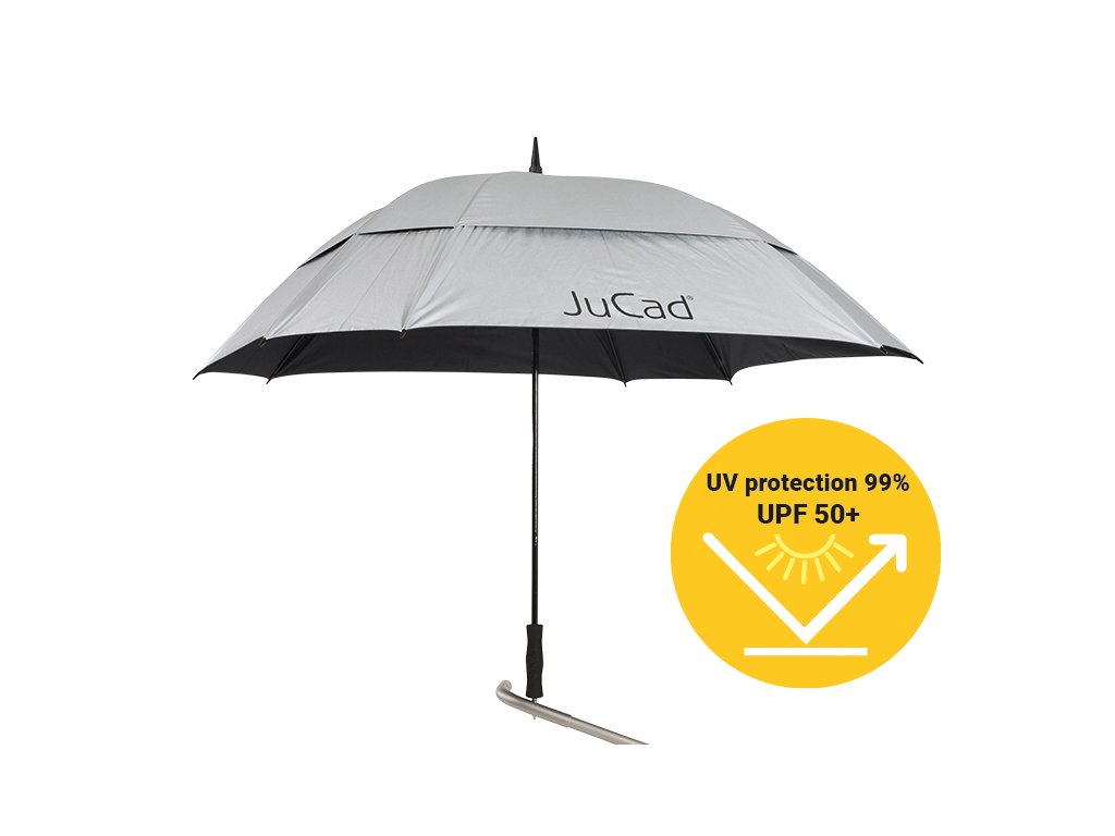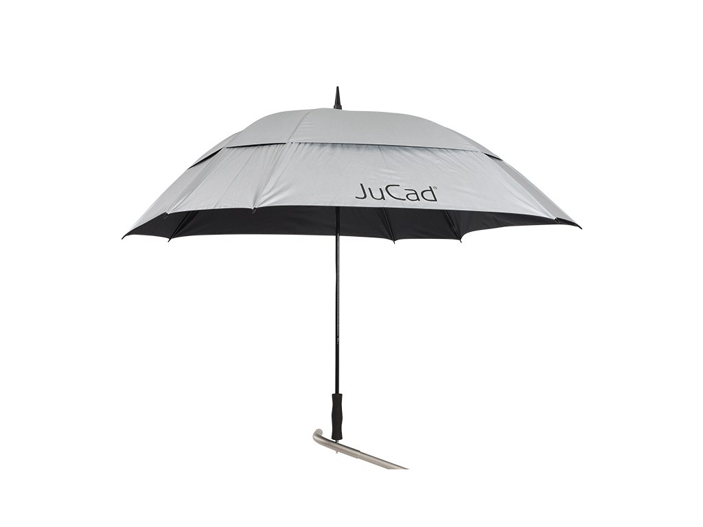 Deštník JuCad čtvercového tvaru s dvojitou stříškou nabízí extra ochranu proti větru při vašem golfu. S kolíkem pro montáž na vozík JuCad. průměr 145 cm.