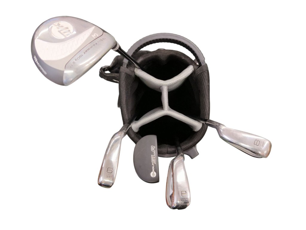Dětský golfový set M Kids pro chlapce o výšce 160 - 165 cm v hraném stavu na levou stranu. Set obsahuje fairwayové dřevo č. 3 s loftem 21°, železa č. 6, 8, PW, putter typu mallet a standbag. Tyto hole jsou na grafitových shaftech. Set je určen levorukým hráčům.