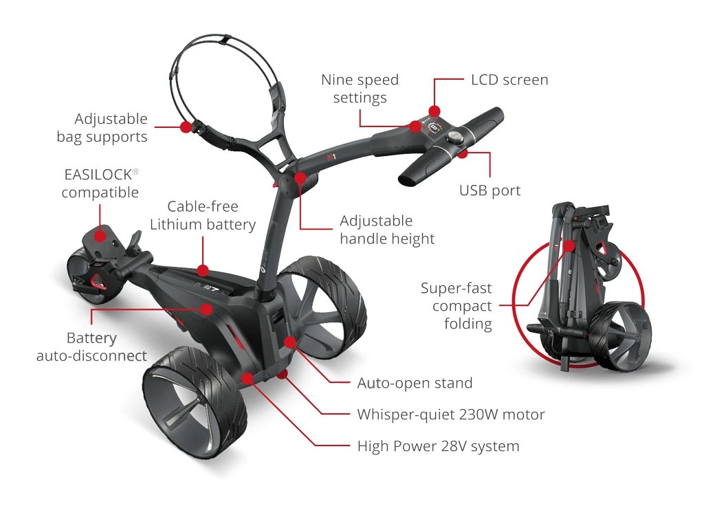 Motocaddy M1 je nejsnáze použitelný kompaktní vozík na světě díky jednoduchému skládání, působivému širokoúhlému LCD displeji a devítirychlostním nastavením.