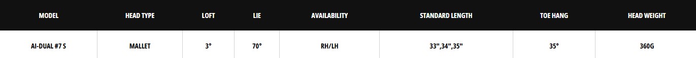 Odyssey Ai-DUAL #7 S přináší legendární mallet tvar #7 v konfiguraci s „S“ hosel krčkem, který vytváří mírný toe hang. Tento profil je vhodný pro hráče s lehce obloukovým (slight arc) patováním, kteří chtějí kombinaci stability malletu a přirozenější rotace úderové plochy během švihu.