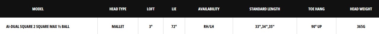 Odyssey Ai-DUAL Square 2 Square MAX 1/2 Ball posouvá koncept „zero-torque“ putterů na novou úroveň. Díky moderní center-shafted konstrukci je shaft umístěn nad rovinou těžiště, což vytváří přirozený „toe-up“ postoj hlavy. Putter tak intuitivně drží úderovou plochu kolmo k dráze švihu a omezuje nechtěnou rotaci během celé fáze patování.