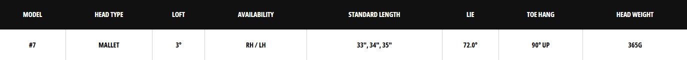 Legendární mallet #7 s typickými „fangs“ nabízí výbornou stabilitu, snadné zarovnání a klid při adrese. Pomáhá držet směr i při méně přesném zásahu.