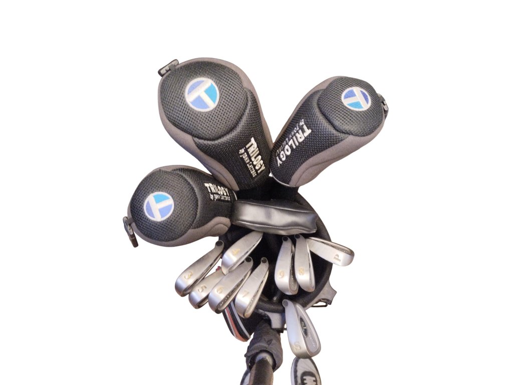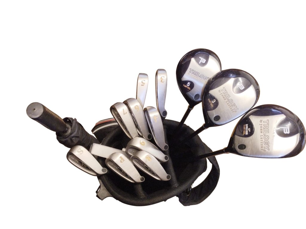 Pánský golfový set John Letters Trilogy na oceli v hraném stavu. Set obsahuje driver s loftem 10°, fairwayové dřevo č. 3 a č. 5, železa č. 3-9, PW, SW, putter typu blade a standbag. Driver a dřeva mají shafty Aldila s regular flex, železa mají shafty True Temper. Hole mají gripy John Letters. Set je určen pravorukým hráčům. Součástí setu je i deštník.