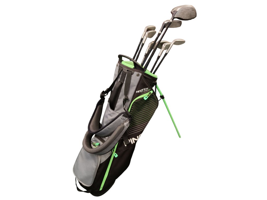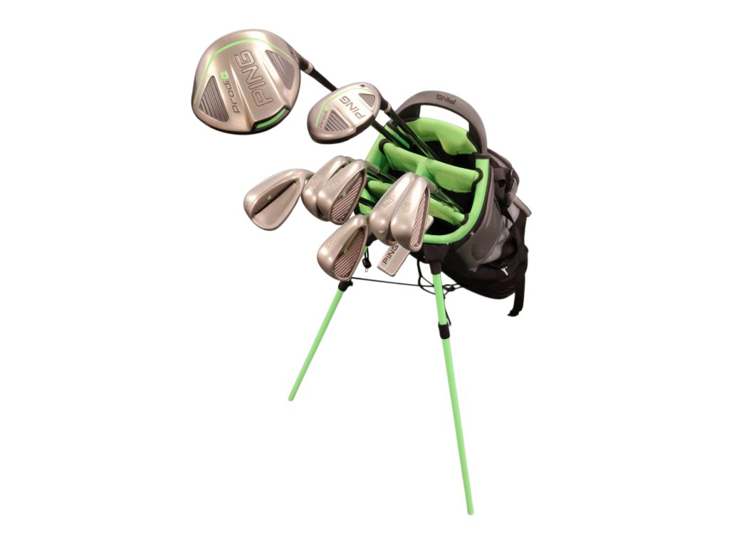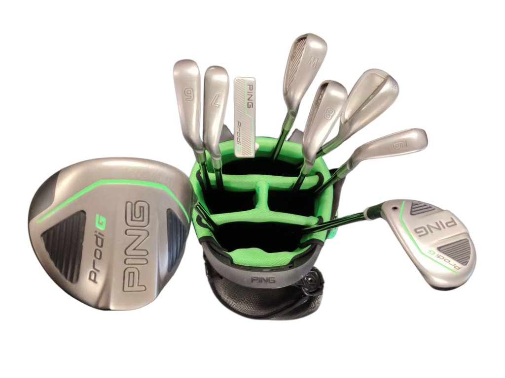 Kvalitní použitý golfový set Ping Prodi G dětský golfový set pro dětské golfisty o výšce do 165 cm. Set obsahuje driver, hybrid s loft 27°, golfová železa č.6-9, PW, SW, putter typu blade a standbag. Hole mají grafitové shafty s junior flex. Set je určen pravorukým golfovým hráčům.