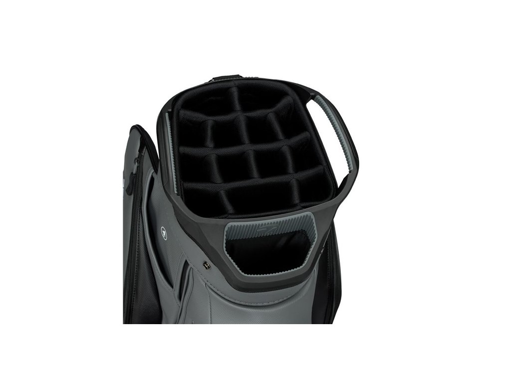 TaylorMade Deluxe Cart Bag v moderním černo-šedém provedení je vysoce funkční a přitom stylový vozíkový golfový bag navržený tak, aby uspokojil potřeby pokročilých golfistů i rekreačních hráčů. Tento bag je speciálně konstruován pro použití s golfovým vozíkem, což znamená, že neobsahuje stojací nožičky, ale místo toho se spolehlivě upevňuje pomocí key-lock systému, který zajišťuje jeho stabilitu během jízdy a manipulace na hřišti.