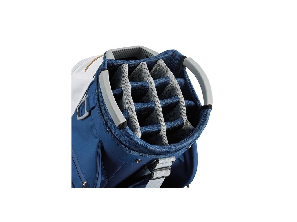 Prostor pro hole: Horní část bagů má 15 komor, včetně specializovaného prostoru pro putter, což zajišťuje přehledné a bezpečné uložení všech golfových holí během hry.
