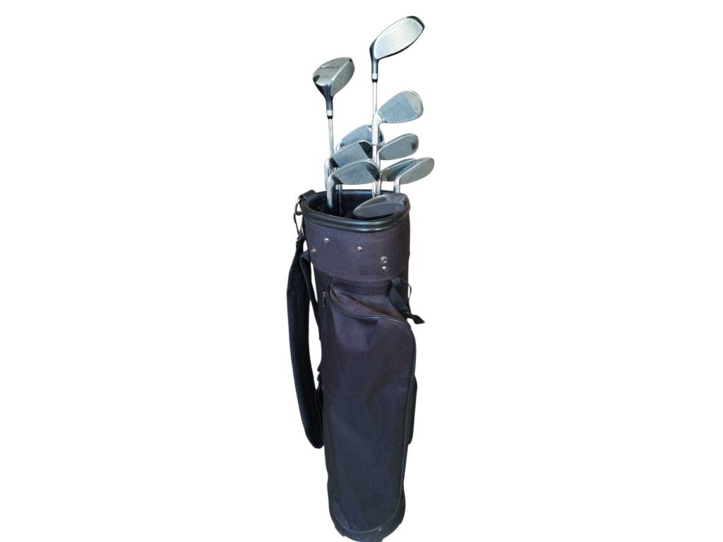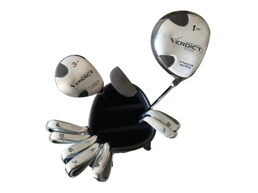 Pánský golfový set Verdict na oceli v hraném stavu. Set obsahuje driver s loftem 10°, fairwayové dřevo č. 3 s loftem 14°, železa č. 5-9 (chybí č.8), PW, SW, putter typu mallet s headcoverem a cartbag. Tyto hole jsou na ocelových shaftech. Set je určen pravorukým hráčům.